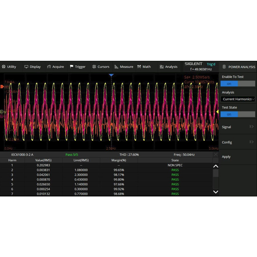 Current Harmonics: Analyzes harmonic content in current waveforms to evaluate compliance with standards.