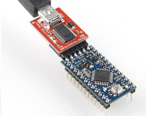 Programmeringsmodul för bla. Arduino LilyPad. Inneåller ett FT232L-chip från FTDI som skapar en virtuell serieport av en USB-port. Kan användas för programmering med automatisk reset till alla Arduino-kort som har reset kopplat till DTR. Avsedd för kort med 3.3V logikspänning.