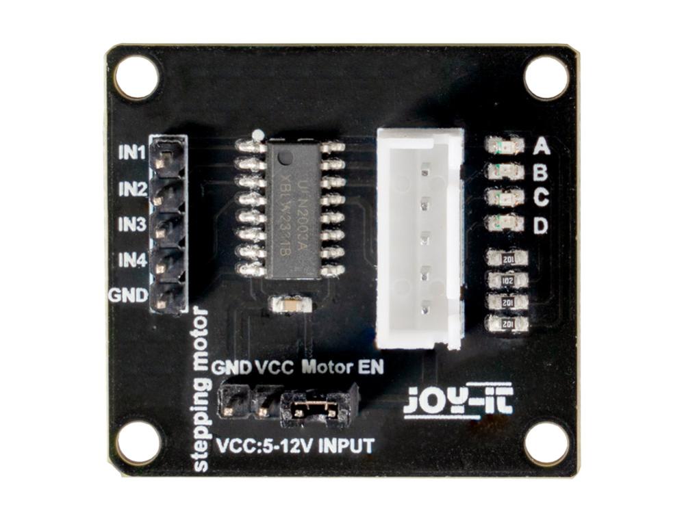 Stegmotor med drivkort baserat på den mycket populära motordrivaren ULN2003A. Kortet kan anslutas direkt till en mikrokontroller och styr stegmotorn genom att skicka alternerande pulser till stegmotorns spolar. Lysdioderna på kortet visar vilka faser/utgångar som är aktiva. Motorn är internt nedväxlad med ca. 64:1.