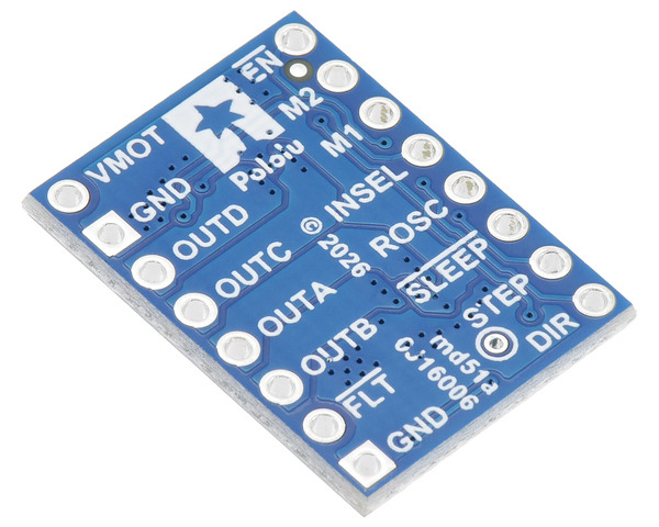 Justerbar strömbegränsning möjliggör optimering efter motor och applikation. Inbyggd regulator eliminerar behovet av separat logikmatning. Kompatibel med 3.3 och 5 V logik gör integration enkel med vanliga mikrokontrollerplattformar. Formfaktor och anslutningar är kompatibla med A4988-baserade kort, vilket underlättar uppgraderingar i befintliga installationer.