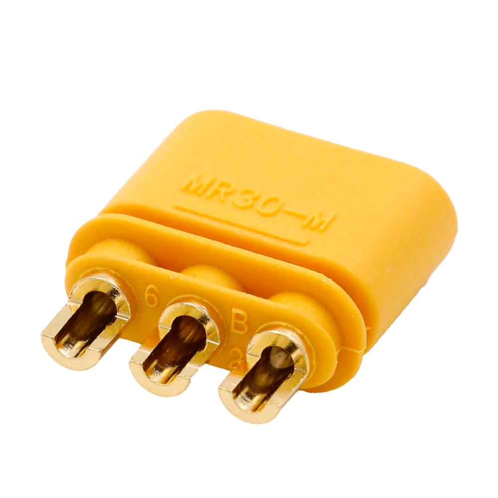MR30-FB (XT30) 3-pol DC-kontakt för kabelmontering, lödanslutning. Med lödskydd. Tillverkad i polyamid (nylon). Lödanslutning för kabel 16AWG (1.5 mm²). Kontakten är vanlig för anslutning av borstlösa motorer, LiPo-batterier, etc. Typisk användning: RC-hobby (flyg, helikopter, drönare).