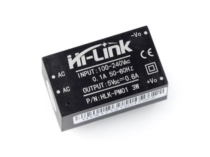 Kretskortsmonterad AC/DC strömförsörjning. Modulen tar 85-265VAC eller 70-350VDC in och omvandlar det till en fast 5V utspänning. Max uteffekt 3W. Utgången är skyddad mot kortslutning, överbelastning och överspänning.
