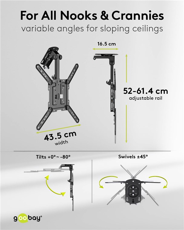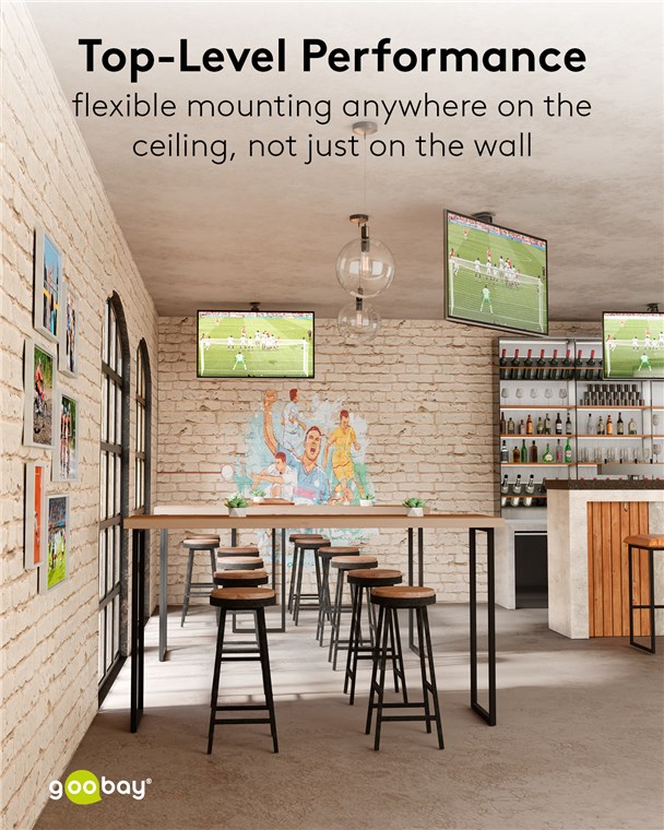 TV-takfäste, även för snedtak, 23-55 tum. Används för takmontering av TV-skärmar. Fästet är vinklingsbart och vridbart vilket gör att det även passar för snedtaksmontage. Passar exempelvis i sovrum eller allrum i 1,5-planshus.