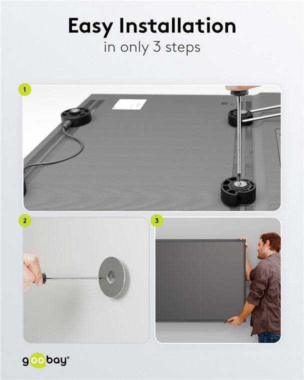 Ultratunt TV-väggfäste, EasyMount Universal. Ett av de mest slimmade fästena på marknaden med mycket liten utbyggnad från väggen. Stödjer skärmstorlekar från 37 till 70 tum (94–178 cm) och klarar en maximal belastning på 50 kg. Skärmen hängs upp likt en tavla via en wirelösning. Levereras komplett med skruvar, pluggar och distanser. Konstruktionen är utförd i stål med flexibel stålwire för upphängning.