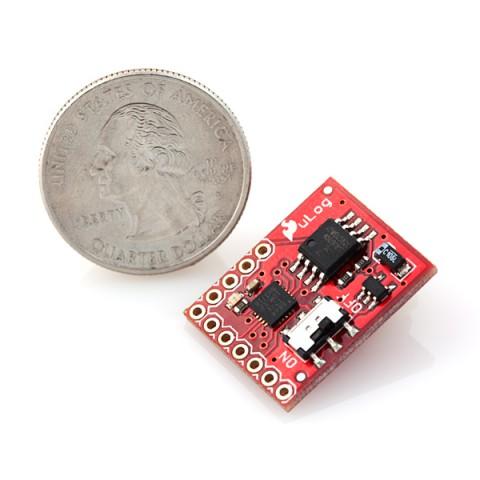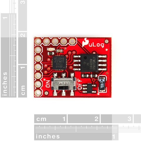 The uLog is a tiny analog datalogger. Central to the logger is an ATtiny24 mated with an AT45DB161D 16Mbit flash IC. Sampling at 50Hz, it'll log 3 channels of 10-bit ADC for about 2 hours before the memory fills up.