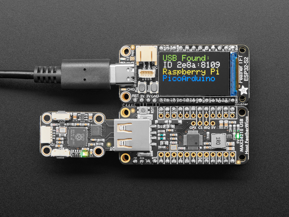 This Wing uses the MAX3421E - a tried and true USB Host chip. It uses SPI plus an IRQ pin to send data to just about any USB device. Note that because the chip is older, and you're limited to the SPI port speed, you're not going to get blazing 480Mbps high speed data transfer. But for basic HID interfacing, or even reading/writing to a Mass Storage device, it does work quite well. There's a famous USB Host Library that can be used, and it's specialty is AVR support, but also seems to support nRF52 and ESP32. We personally recommend using the TinyUSB Arduino library - however the trade-off is that the chip must have TinyUSB support already which means it's great for RP2040, ESP32-S2 or S3, nRF52840, SAMD21/51 chips. Between the two libraries, just make sure your desired Feather mainboard is supported before purchasing!