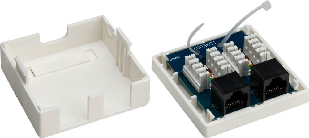2-vägs utanpåliggande nätverksuttag. Anslutningsplintarna är av IDC/LSA-typ (Lödfri Skruvfri Avisoleringsfri). Anslutning sker med slitsverktyg, exempelvis 41010613 eller 41032546.