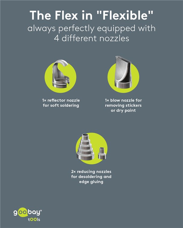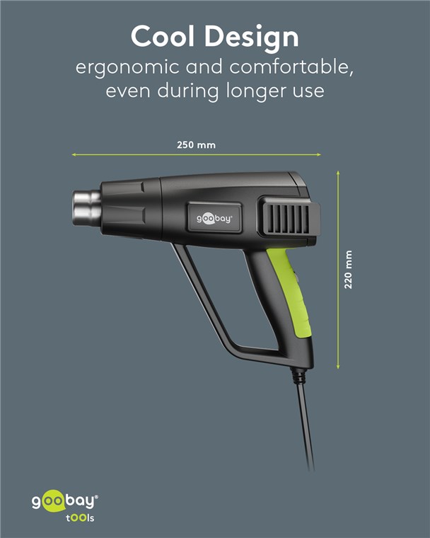 Justerbar varmluftspistol med 1500W effekt och två temperaturlägen, 100-300°C och 300-650°C. Luftflöde 450 l/min. Fyra olika munstycken ingår, ett platt munstycke för att ta bort etiketter och färg, en reflektor för mjuklödning och två smalare munstycken för avlödnong och kantlimning. Den kan även användas för att t.ex. torka fukt, krympa krympslang, laga mindre repor i vissa plaster, forma föremål i metall eller termoplast, m.m. Kan också användas utan munstycke monterat.