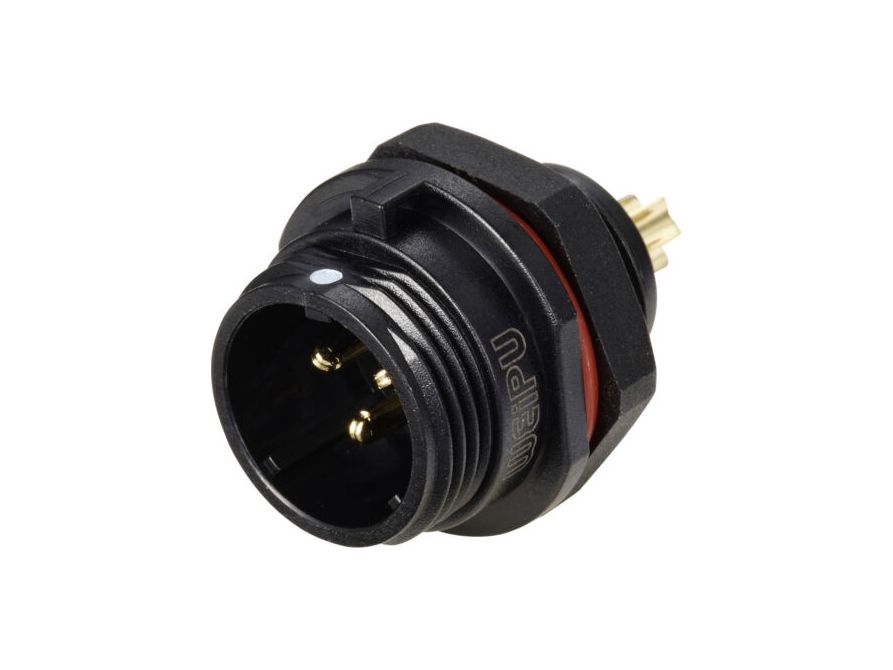 Vattentät universalkontakt för chassimontering med tre poler. Kontakterna har gänglåsning och är IP68-klassade. En tätande gummiring komprimeras bakom muttern för att försegla öppningen i chassit.
